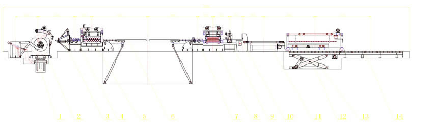 Vehículo de carga de bobina hidráulica, desbobinador de tensión hidráulico,soportes y prensadores de la cabeza de bobina hidráulica, guía lateral ME en primer lugar, nivelador 4-h acumulador hidráulico, guía lateral 2, nivelador de precisión 6-hi, dispositivo laminación de película, cizalla mecánica de alta velocidad, mesa de entrega de los rollos, plataforma de apilamiento neumático, colector de las chapas de elevación hidráulica, mesa de descarga de las chapas, sistema hidráulico, sistema neumático, control eléctrico.
