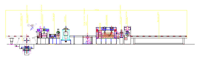 La línea de corte de acero plano esta compuesta por vehículo de carga de bobina, desbobinador, pizca de alimentación de doble rodillo, guía lateral, cortadora de disco, bobinadora borde de la chatarra, mesa de transmisión, nivelador, cizalla, mesa de embalaje.